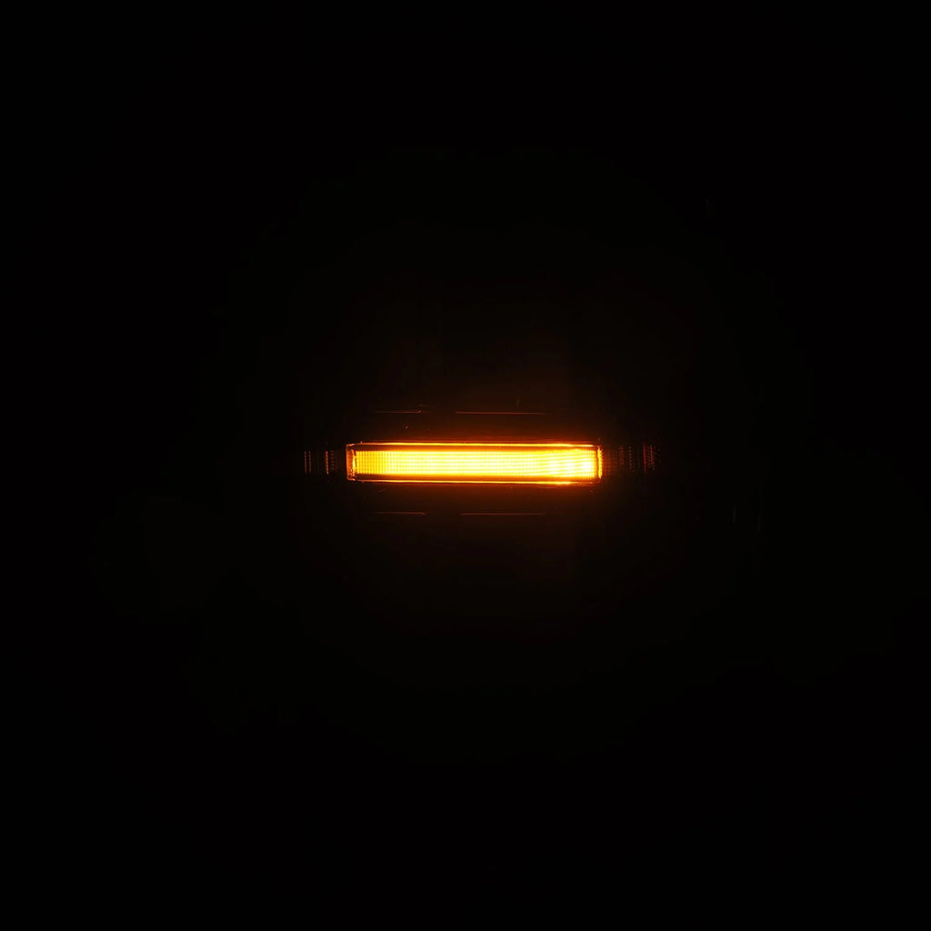The trapezoidal prisms illuminate with red LEDs for parking lights, intensifying when braking. For turn signals, amber LEDs activate at the center bar between the prisms in a dynamic sequential flow, adding a modern touch. The bottom two LED prismatic tubes light up with white LEDs as a reverse indicator.