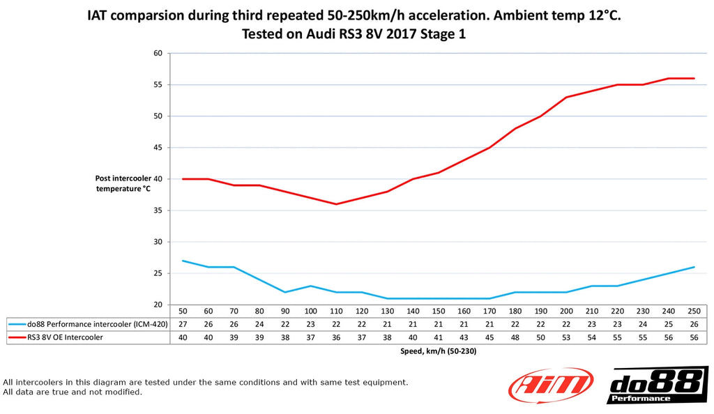 During tough temperature tests on a closed air strip, not only did we see a reduction in intake air temperature, but the Dragy device installed in the car, showed a consistent reduction in 100-200km/h acceleration time by a half second with our intercooler in place! While it may sound modest, this is a considerable gain witnessing of the power increase.