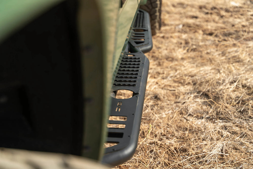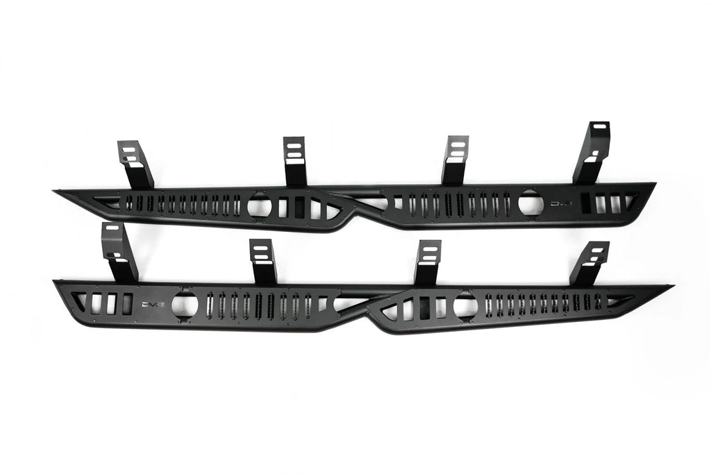 Our OE Plus Series Tundra Side Steps allow you to safely enter and exit your crew cab without having to worry about slippage. The step's top plates have an anti-slip surface to prevent unsteady footing when in wet or dusty conditions. These mount at several points to your Tundra’s body/pinch weld for a stable design that won’t flex when stepped on. Their low-profile fitment retains your truck’s factory side clearance, so you can navigate rocky trails while still having access to a functional step for you and your passengers. The side step’s durable steel design provides protection from rocks kicked up by your tires, as well as branches and shrubs that brush against your truck when off-road. They are finished in a sleek micro-texture black powder coat that complements your Tundra’s factory exterior. The steps are fully bolt-on for a stress-free install process. Whether you need secure footing when entering/exiting your truck or an elevated finish for your off-road build, DV8’s side steps offer the perfect combination of function and style.