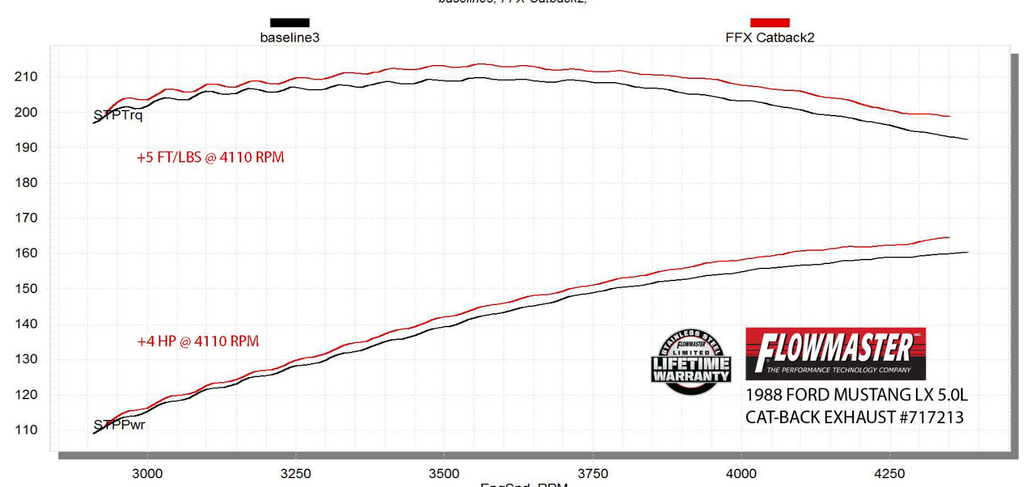 This Flow FX cat-back exhaust system is designed for the 1986-1993 Ford Mustang LX (1986 GT) with the 5.0L engine. Features include 409 stainless steel construction for added durability and 16-gauge 2.5-inch mandrel-bent tubing for unrestricted exhaust flow. Stock style, polished stainless steel tailpipes give your car the classic 5.0 look and have the Flowmaster logo laser etched along the side for added style. The stainless "straight-through" Flow FX performance mufflers deliver a moderate yet deep and powerful sound while the interior sound is kept very mild. The system uses the factory hanger locations and includes detailed instructions and all hardware necessary for a quick and easy installation you can do at home. Backed by Flowmaster's Lifetime Limited Warranty.
