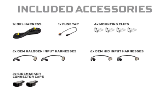 Accessories : 2x Halogen Adapters, 2x OEM HID Adapters, 1x DRL Harness, 4x Mounting Clips, 2x Side Marker Connector Caps, Fuse Tap Hardware