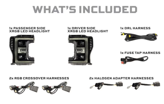 Accessories : 2x RGB Crossover Harnesses, 2x Halogen Adapter Harnesses, 1x DRL Harness, 1x Fuse Tap Harness