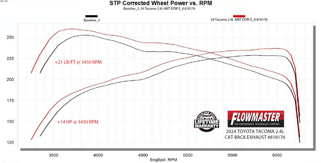 This Flowmaster® American Thunder® cat-back exhaust system for the 2024-2025 Toyota Tacoma with the 2.4-liter engine is manufactured using durable 409 stainless steel throughout and features 3-inch and 2.5-inch mandrel bent pipes for better exhaust gas flow. A 50 HD series muffler is used for maximum performance and delivers a moderate sound inside and out. This system offers dual out the rear or side exit options with 4-inch polished stainless steel tips for a custom look. Max dyno gains of 14 hp and 21 lb-ft at the rear wheels. The system uses factory style hangers and includes installation instructions and all necessary hardware for an easy installation that you can do at home. Backed by Flowmaster's Lifetime Limited Warranty.
