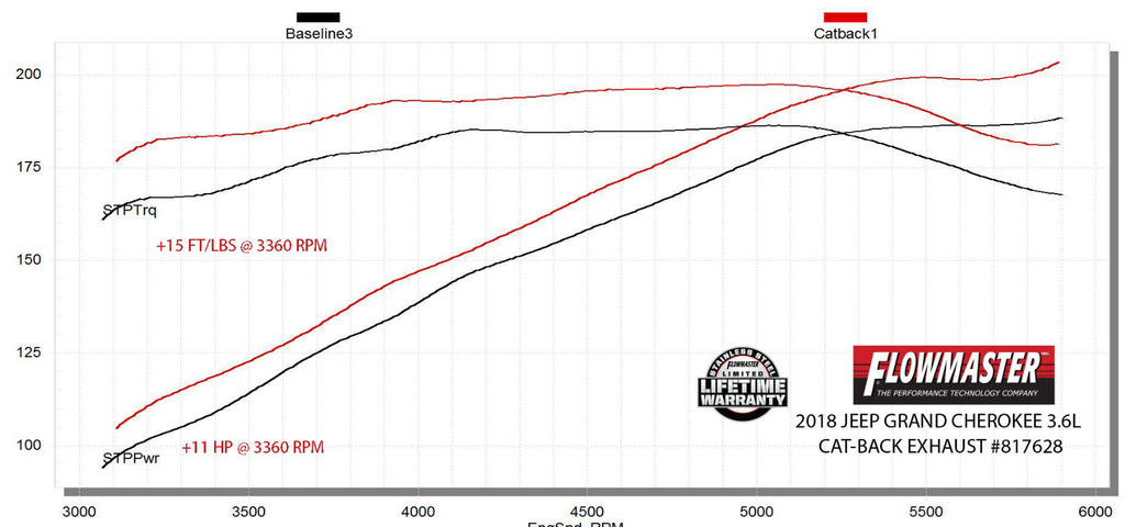 Flowmaster introduces our Force II stainless steel cat-back exhaust system for the 2011-2022* Jeep Grand Cherokees (*2022 Grand Cherokee WK Only) with the 3.6-liter engine. This system use a Super 50 series muffler for a moderate to mild sound level and increased performance. Tuned resonators help keep the interior sound level low for a comfortable ride. Mandrel bent 409 stainless steel tubing allows for maximum exhaust flow and durability. This system uses larger 4.00-inch polished stainless steel tip for a custom look. Max dyno gains of 11 hp and 15 lb-ft at the rear wheels. All of the necessary hardware is included, and factory-mounting locations are used for an easy installation. Backed by Flowmaster's Lifetime Limited Warranty.