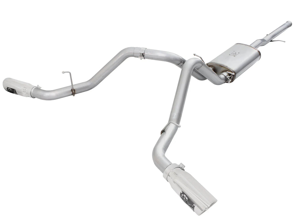 aFe is proud to introduce the MACH Force-Xp dual side-exit cat-back exhaust system for the 2014-2019 GM Silverado/Sierra 1500 with V6-4.3L/V8-5.3L engines. This cat-back exhaust system is constructed out of 3" 100% MIG-welded, mandrel-bent, stainless steel tubing for maximum flow. The smooth transition bends allow for low turbulence, increasing horsepower, torque and improving throttle response. In testing, this system resulted in gains up to +14 horsepower and +17 lbs. x ft. of torque verified by our in house dyno (vehicle tested 5.3L engine). A hi-flow 21" single-in dual out muffler is included which improves performance across the power band while maintaining an awesome sound. This unit uses all factory mounting locations and comes with a bolt-on bracket that supports the driver side tailpipe. The aFe power dual side exit exhaust system was designed to retain the spare tire and includes high quality band clamps and OE-style bayonet hangers. This makes for an easy installation with no cutting required. To finish off the exhaust, are massive dual 4-1/2" high-luster polished stainless steel tips with a laser-cut stainless steel aFe POWER badges for an aggressive style.