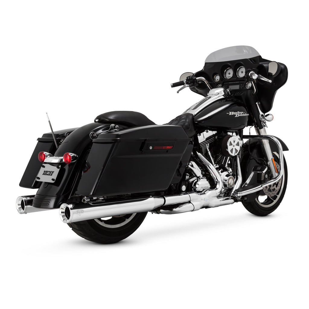 Often imitated, yet never duplicated, Power Duals head pipes have set the standard for high style on late model baggers with its contoured collector shield, crowned with the iconic Vance & Hines v-twin crest. Now, that exquisite style gets a fresh injection of greater performance thanks to our innovative PCX™ Technology, which utilizes chambered high-flow catalysts combined with stepped headers to increase mid-range torque for more responsive acceleration off the line and positioned downstream to optimize rider comfort. Power Duals pair perfectly with all Vance & Hines Touring slip-ons like Hi-Outputs, Torquer 450s, or Eliminator 400s.