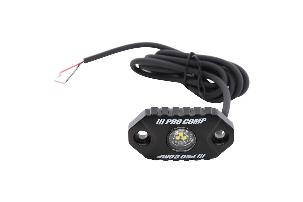 | Designed with the off-roader in mind, Pro Comp's new rock lights utilize waterproof aluminum LED housings for safe and reliable performance in all weather conditions. Each of the six white rock light circuits is fitted with 3x 3W CREE RGB LEDs with long leads to allow you to mount the LEDs in a variet of locations depending on your application for greater visibility. Includes hardware and wiring instructions. |