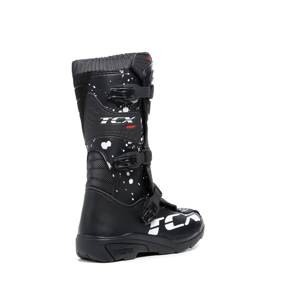 Comp Kid children’s motocross boots are a TCX classic for young MX riders. The equipment and structure replicate the adult models, with microfiber upper, breathable AIR TECH lining and adjustable fastening with polyurethane levers. TCX Comp Kid are CE certified motocross boots, designed to offer protection but at the same time sensitivity and the right bending when riding, for excellent comfort at all times. The reinforcements for shin, ankle and toe in polyurethane guarantee maximum foot and leg protection. The anatomical insole can be removed for the greatest comfort and the tread is made of wear-resistant rubber for optimal grip on foot pegs and ground.