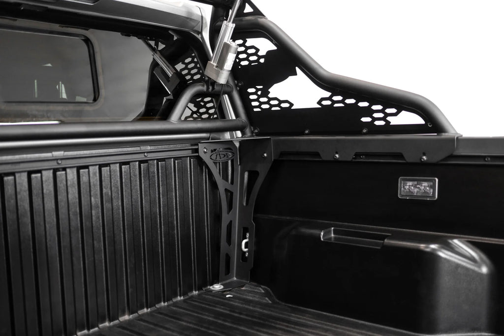 The durable design of the chase rack and the included bed cab corner braces add additional rigidity and further strengthen your truck bed when adventuring off-road. Made from steel, this rack will withstand the toughest terrain. The resilient dual-stage hammer black powder coat finish with satin black lightweight aluminum side panels provide utility and an aggressive style to your Tacoma. As always, ADD’s chase rack is proudly made in the USA.