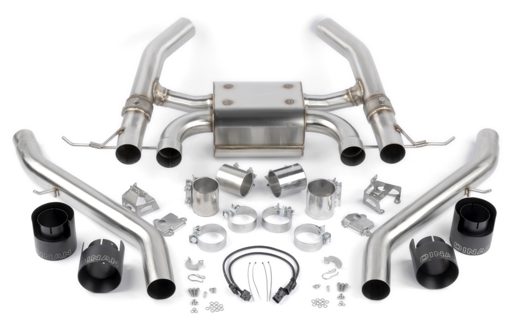 - Four, diffuser filling, 4.5-inch (114mm) double-walled, black ceramic coated clamp-on tips with laser engraved Dinan logo