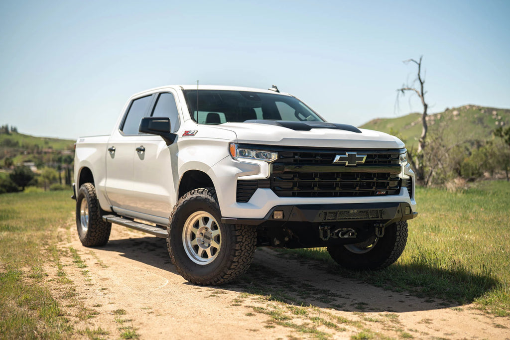 The Chevy Silverado Front Bumper is made from heavy-duty steel, and is finished in a resilient micro-texture black powder coat with satin black accent panels that enhance your truck’s sleek exterior. The bumper is compatible with the OEM parking sensors, front camera, and adaptive cruise control. The install process is straightforward, and the integrated zip tie tabs allow for clean wire management. With our Spec Series Front Bumper, you can improve your rig’s off-road utility while hitting the trail in style.