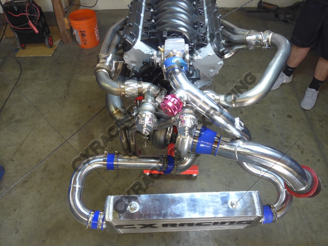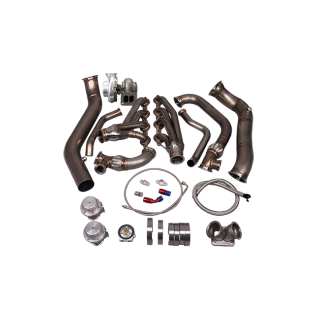 Turbo Headers + Cross Pipe + Turbo + Wastegates + Downpipe + Intercooler + Piping Kit + Radiator + Shroud+ Fans + Mounting Brackets