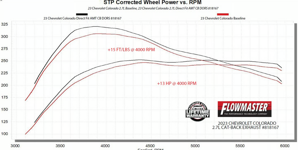 This Flowmaster® American Thunder® cat-back exhaust system is for the 2023-2025 GM Colorado/Canyon with the 2.7-liter turbo engine. This system is manufactured using durable 409 stainless steel tubing and features 3.00-inch to dual 2.50-inch mandrel bent pipes for better exhaust gas flow. A 50 Series Big Block muffler is used for an aggressive to moderate sound level and maximum performance. Maximum increases on the dyno revealed 13 hp and 15 lb-ft at the rear wheels. This system exits out the rear or side of the truck with dual 3.5-inch polished stainless steel tips for added style. The system uses all the existing factory hanger locations and includes installation instructions and all necessary hardware for an easy installation that you can do at home. Backed by Flowmaster's Lifetime Limited Warranty.
