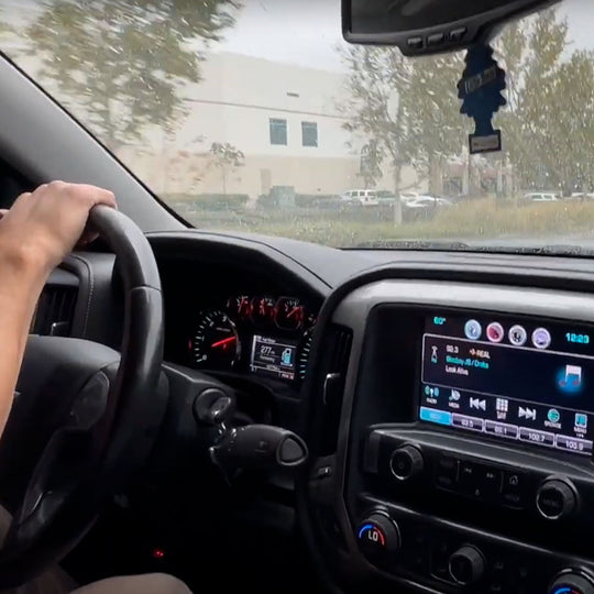 The huge air filter and tube produce a more aggressive sound than stock. Click the play button to listen from outside and inside the cab.