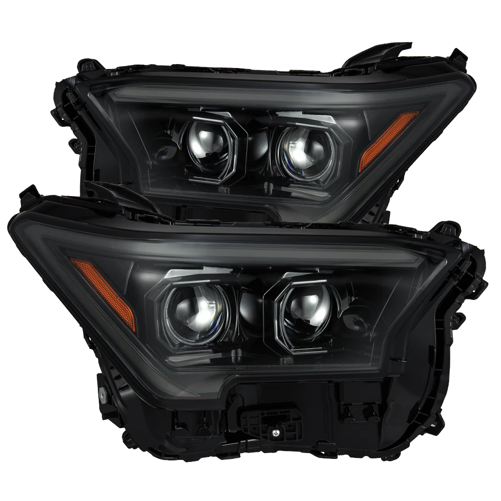 Experience the sleek sophistication of our 4th gen Toyota Tacoma / 6th gen Toyota 4Runner LUXX-Series Headlights in Alpha-Black themed housing, specially designed with a glossy black finish and black accents to give your 4th gen Toyota Tacoma / 6th gen Toyota 4Runner a sporty chrome-delete appearance.