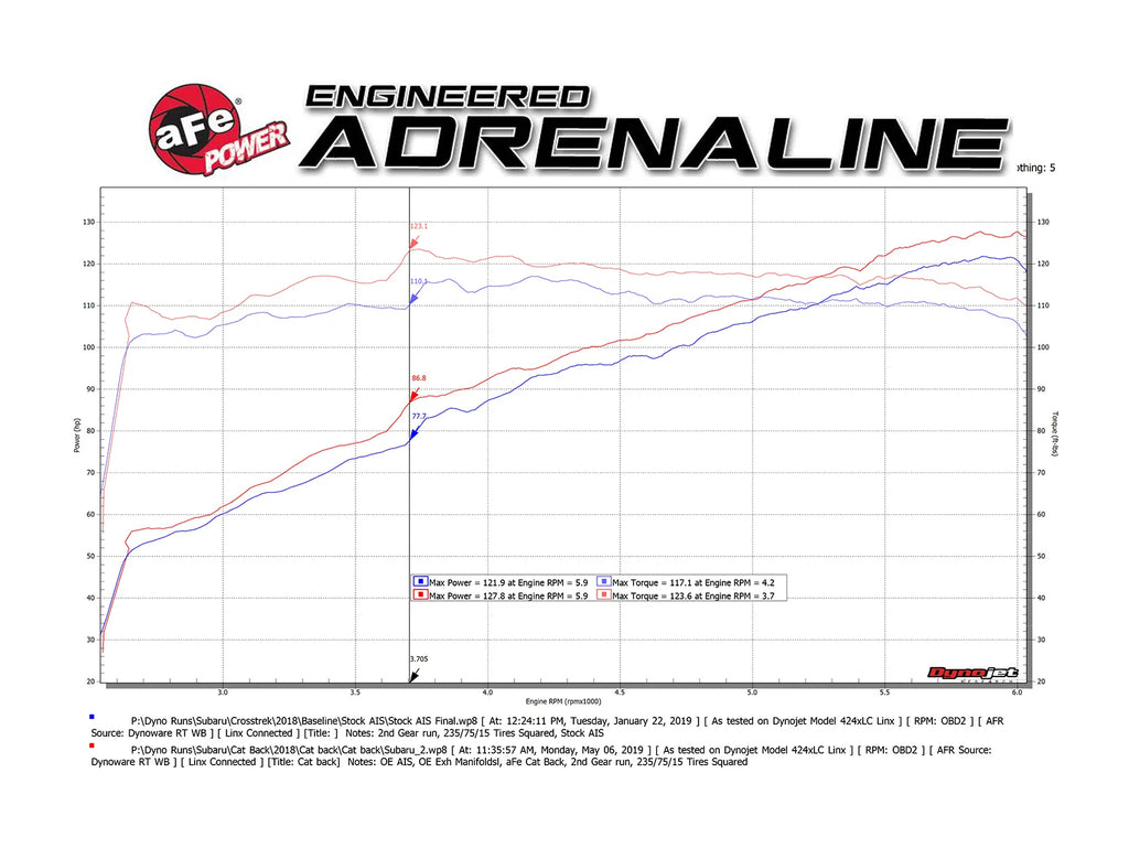 In testing, this cat-back exhaust system produced gains up to +9 HP and +13 lbs. x ft. of TQ, as measured on our in-house dyno.