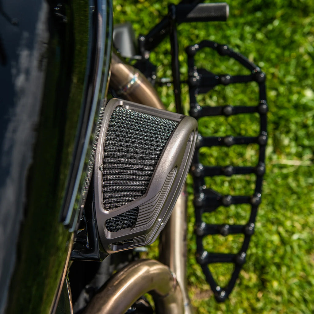 The Sidekick air cleaner is an angled version of our forged billet air cleaners that provides excellent legroom and increased airflow. The performance air filter is made from a black synthetic filter element wrapped in a stainless steel mesh and accepts a clear polycarbonate window to view your intake system in action