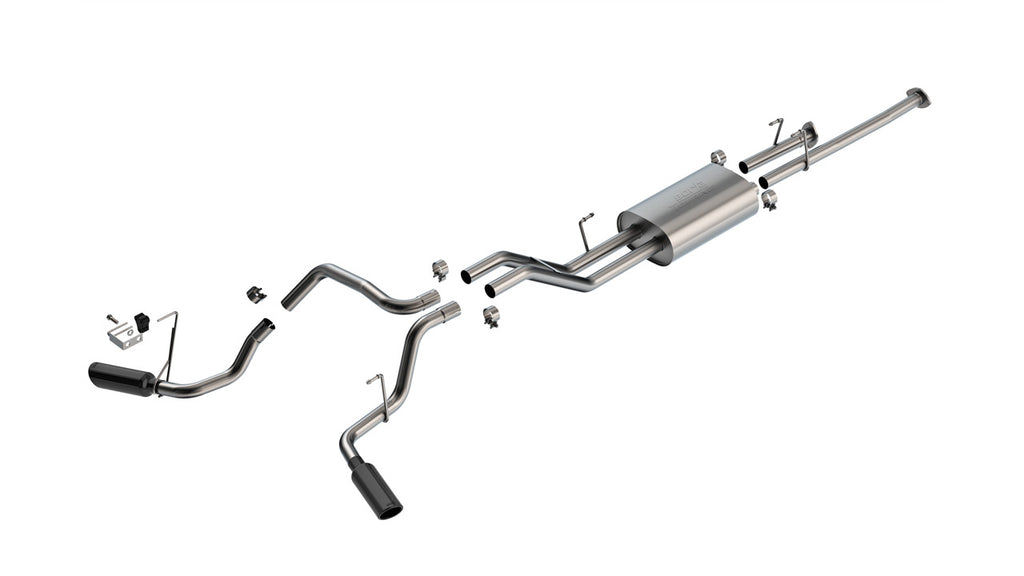 This BORLA® 2.25" diameter Cat-Back™ system is a True Dual, split side exit, with single 4" round black chrome on T-304 stainless steel tips on each tail pipe. Using BORLA® Stainless Steel Polish p# 21461 is NOT recommended with these black chrome tips. We suggest cleaning the tips with hot water and a microfiber cloth. A system with bright chrome on T-304 stainless steel tips is also available. This system gives the Tundra a great look, pure performance V-8 growl, and a nice performance kick. The muffler contains an internal H-Pipe for increased performance and improved sound. The system delivers the mellow Touring sound with no drone inside the vehicle. The full dual system even weighs less than the factory single system, thanks to the lightweight T-304 stainless steel fabrication and, not surprisingly, out flows the stock exhaust. It even exhibits better fuel economy numbers which is nice for a big truck. BORLA® Cat-Back™ & Axle-Back exhaust systems feature patented straight-through and multi-core technology to unleash hidden horsepower. Increased exhaust velocity adds power, driving excitement, fuel economy, and the distinctive BORLA® Sound of Power respected by motoring enthusiasts everywhere.