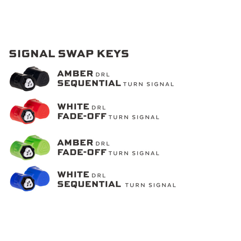 - Signal Swap: The DRL can be configured to run in either white or amber, while the turn signals can operate sequentially or in a more traditional on-off mode with an elegant fade-off effect.