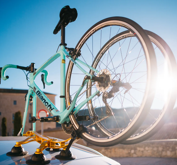 Is our Komodo the most beautiful bike rack in the world? We certainly think so. This road-bike-specific rack is machined out of solid aluminum so that each part fits with precision. Anodized in a variety of colors; Black, Silver, Blue, and Gold. This rack is designed for sports cars and convertibles – cars that don’t have a lot of open space to attach a rack, but this beauty can be used on any car. Thanks to its articulating feet, you only need 18" x 12" of space to mount the rack.