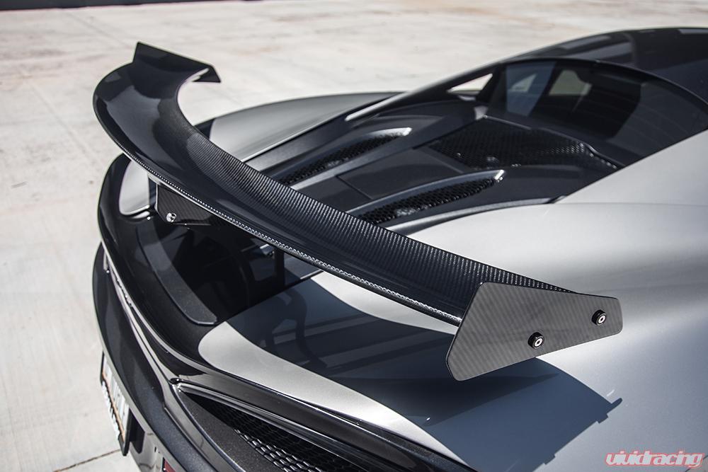 The full carbon fiber wing is extremely light weight and the carbon fiber weave is a match to the factory McLaren carbon. The new uprights were engineered by Vivid Racing to offer adjustability in the wings rake to change the downforce if desire. The laser cut aluminum uprights feature a clean beveled edge and are then powdercoated in a matte black. The holes on the uprights allow for up to 15 total adjustments where each hole is 3 degrees. In addition, the wing uprights can be extended upwards to change the height of the wing 1.75 inches from its lowest position.