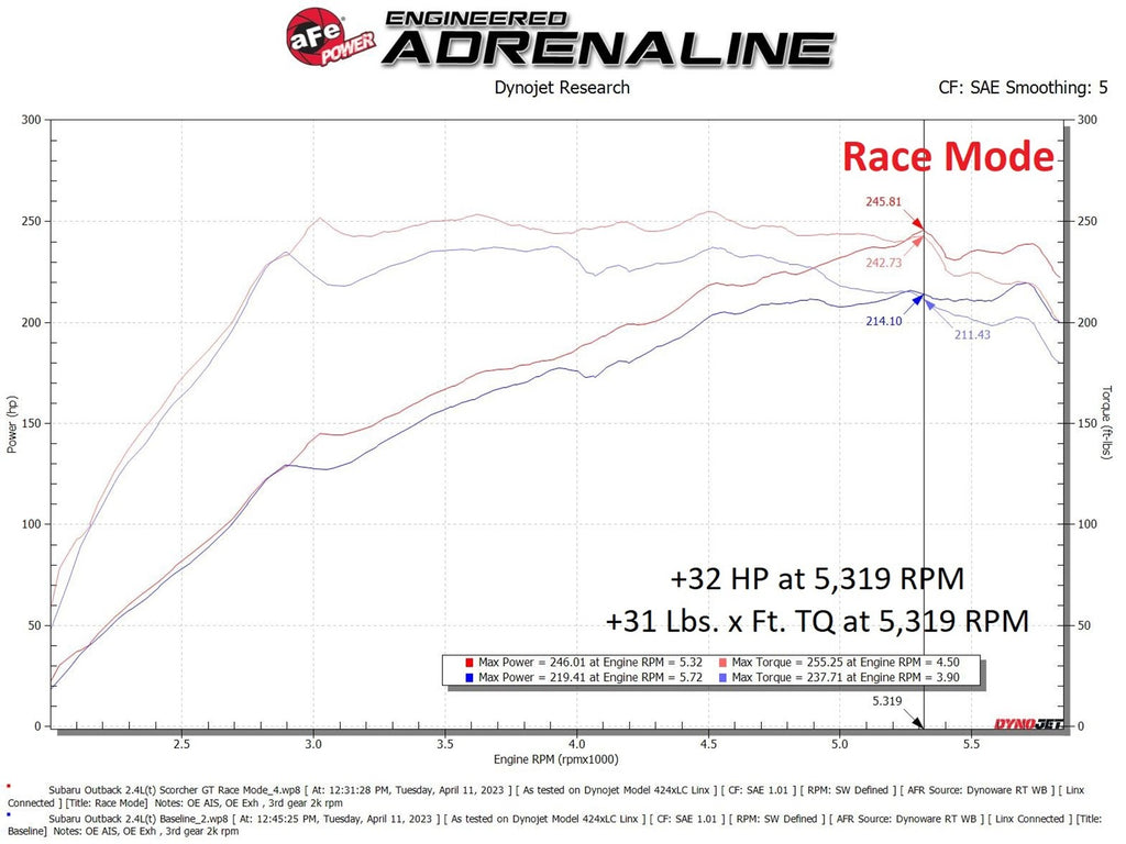 - Dyno tested and produced power increases of +32 HP and +31 lbs. x ft. Torque in race mode at 5,319 RPM